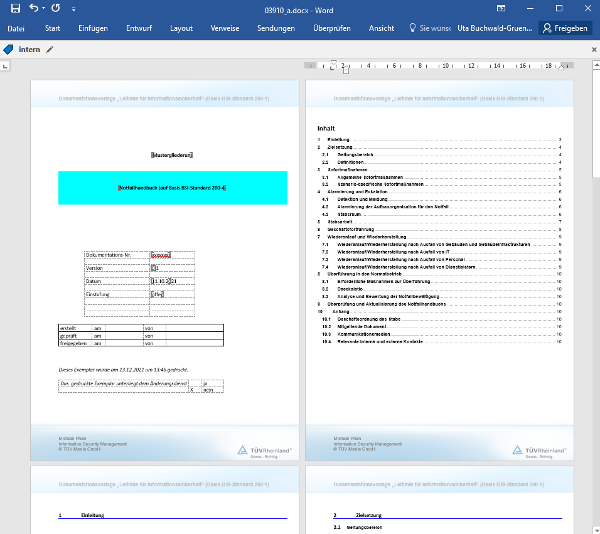Das Bundesamt für Sicherheit in der Informationstechnik (BSI) bietet eine geeignete Dokumentenvorlage zur Erstellung der Leitlinie auf der Basis des BSI-Standards 200-4 zum Download an [1].