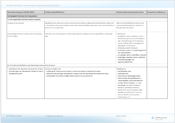 Dieser Beitrag richtet sich an Auditoren und Managementsystembeauftragten, die am Aufbau und an der Pflege eines Künstliche Intelligenz Management Systems (KIMS) beteiligt sind. Er soll das Verständnis für die Normforderungen erhöhen, Anregungen für deren unmittelbare Umsetzung geben und mit der Audithilfe, in der die Anforderungen der ISO/IEC 42001:2023 interpretiert werden, eine konkrete Hilfestellung bieten.