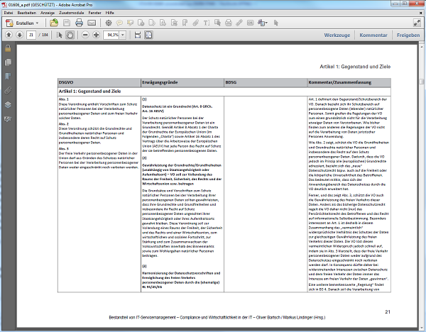 Bei der Auseinandersetzung mit den Regelungen der Datenschutzgrundverordnung (DSGVO) und des Bundesdatenschutzgesetz (BDSG) wird schnell deutlich, dass sie in ihrer Struktur und Systematik sehr unübersichtlich sind. Dieser Beitrag macht die Texte für die Praxis verständlich. Hierzu listet er die Gesetzestexte aller 99 Artikel der DSGVO tabellarisch auf und ordnet ihnen die entsprechenden Erwägungsgründe zu. In einer weiteren Spalte zeigt er, welche Regelungen im BDSG (die seit Mai 2018 gültige Fassung) mit dem jeweiligen Artikel der DSGVO korrespondieren. Eine vierte Spalte liefert eine verständlichen Zusammenfassung und erläuternde Kommentierung des Artikels und der korrespondierenden Regelungen des BDSG.