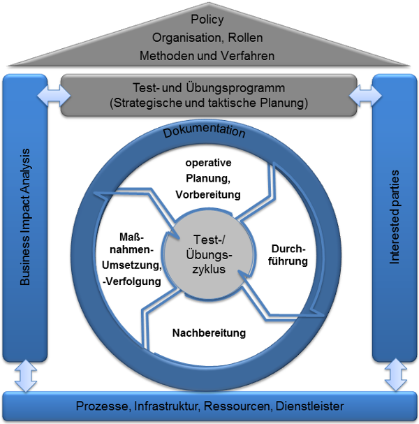 Tests und Übungen sind im BCM und ITSCM elementar, um die Funktionsfähigkeit der Notfallvorsorge für Geschäftsprozesse und deren Ressourcen zu überprüfen und sicherzustellen. Neben der Überprüfung der Notfallvorsorgemaßnahmen trainieren Tests und Übungen die Beteiligten in den Notfallprozeduren und geben hierdurch eine größere Sicherheit im Umgang mit ungeplanten Ereignissen. Die wesentlichen Komponenten eines Test- und Übungsprogramms sind die übergreifende Test- und Übungsrahmenplanung, die Festlegung von Test- und Übungsarten zur Erreichung der Testziele, Methoden, Verfahren und Templates zur Vorbereitung, Durchführung und Auswertung von Tests und Übungen sowie zur Dokumentation.