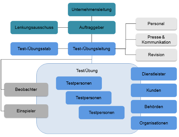 Die Test- und Übungsorganisation ist im Testkonzept zu konkretisieren. Hierzu zählt die personelle Besetzung der internen sowie der externen Rollen.