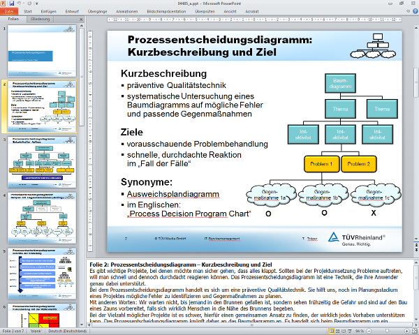 Das Prozessentscheidungsdiagramm betrachtet systematisch, welche Probleme oder Fehler bei der Umsetzung eines geplanten Vorhabens auftreten können und welche Gegenmaßnahmen dann zu ergreifen sind. Es handelt sich damit um ein Werkzeug zur vorbeugenden Qualitätssicherung.